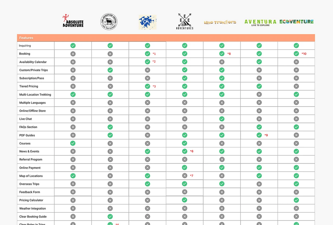 كامب أدفينشرز مؤسسة تجارية متخصصة في تنظيم فعاليات التخييم في أراضي الإمارات العربية المتحدة. المشروع فريد من نوعه بالنسبالي، أول مرة أعمل حاجة في المجال ده عمومًا. وعشان كدا قررت أوسع نطاق المقارنة وحللت 7 منافسين في أكثر من 30 محور.