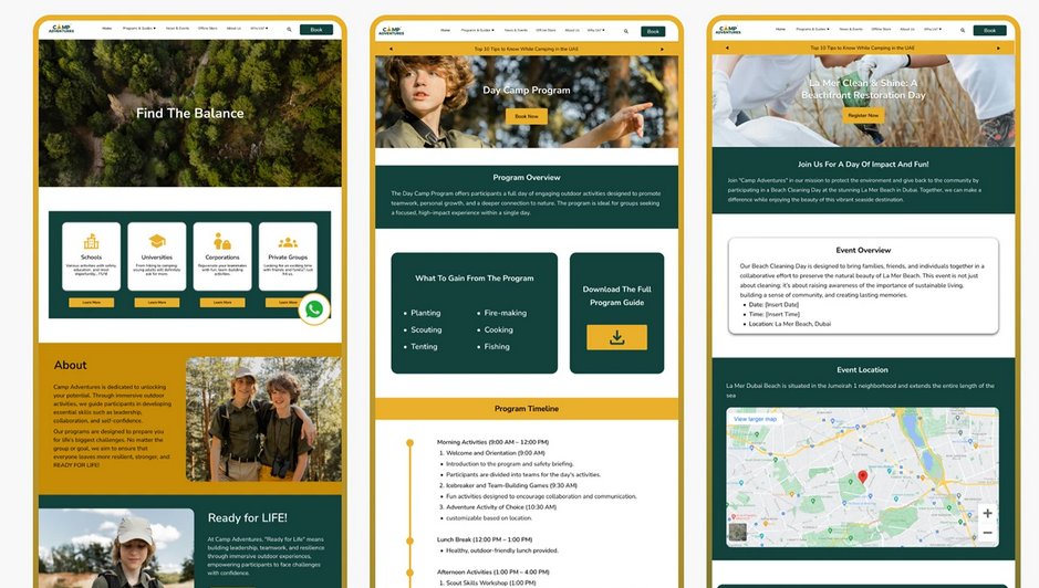 أنا صممت الـ Wireframes وحاطت في بالي حاجتين: المنصة دي هتتفتح من أولياء أمور ومدراء مدارس - اليوزر لازم ياخد أكشن في كل صفحة. عشان كدا كل صفحة إما بيكون فيها الفائدة بشكل مباشر في أول كذا فقرة، أو في زرّ معين بيحفز اليوزر أنه يأخذ أكشن معين في الموقع، سواء كان تواصل، حجز، أو فتح خريطة برنامج تخييم معين.